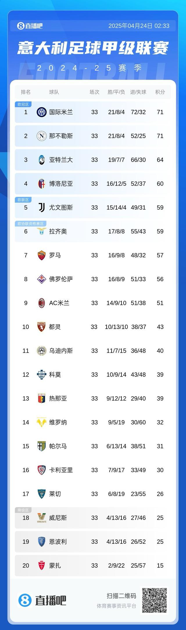 直播吧04月24日讯 尤文本轮0-1不敌帕尔马,拉齐奥2-0击败热那亚,佛罗伦萨2-1卡利亚里。积分榜最新情况如上图。